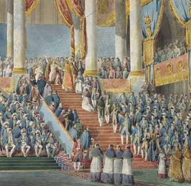 Depuis la Révolution française, la monarchie des Bourbons a été renversée et le roi Louis XVIII, frère et successeur de Louis XVII, est exilé, et n’a jamais été sacré à Reims selon la tradition royale. Napoléon profite de cette rupture pour instaurer sa propre légitimité et inaugurer la dynastie des Bonaparte à Notre-Dame, et son choix du titre d’empereur n’est pas anodin. Napoléon ne souhaite pas se présenter comme un simple roi mais comme l’héritier d’une tradition plus ancienne, remontant à Charlemagne. Depuis la Renaissance, cette référence à l’Antiquité et aux grands empires est omniprésente dans la culture politique européenne. En adoptant ce titre, Napoléon cherche à inscrire son pouvoir dans une histoire prestigieuse.
